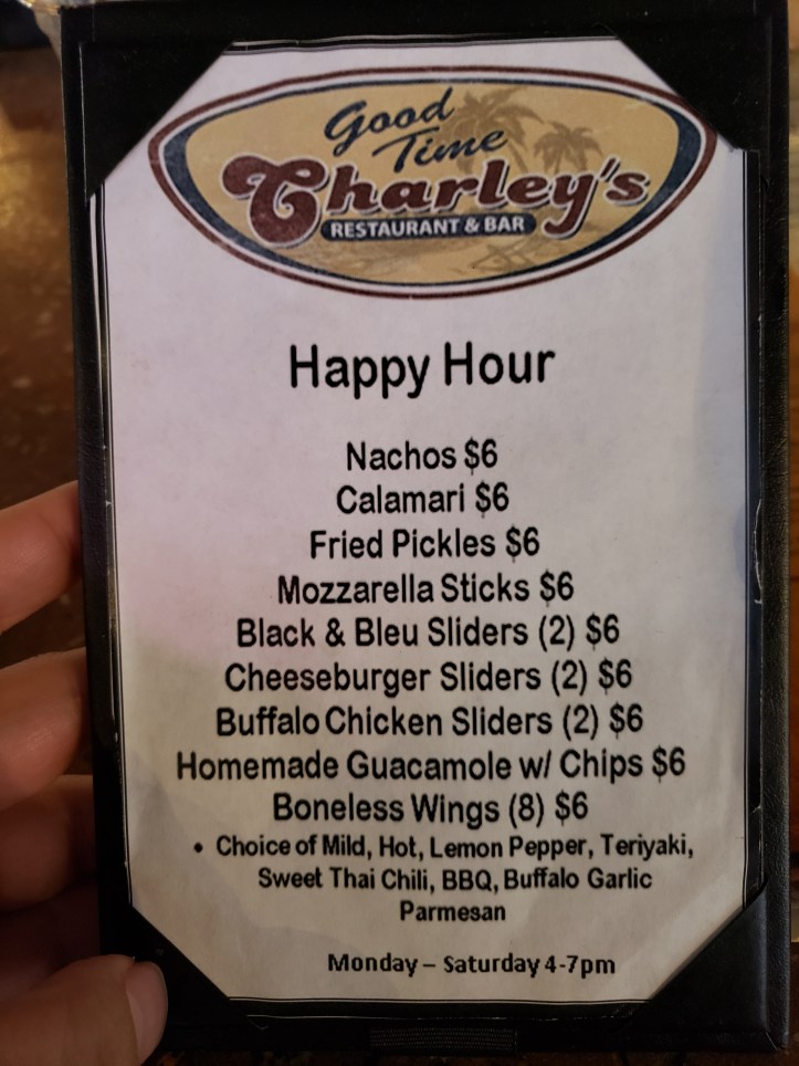 Good Time Charley’s located at Broadway at the Beach is a good time when it comes to food. Great service great Happy Hour, options a lot better than even some of the online reviews which is why we do this. Black and Bleu Sliders and Buffalo Garlic Parmesan Chicken were Excellent. Will definitely be back to this establishment. Food clocks in at an 8, Atmosphere 8.5 and Value 8.0