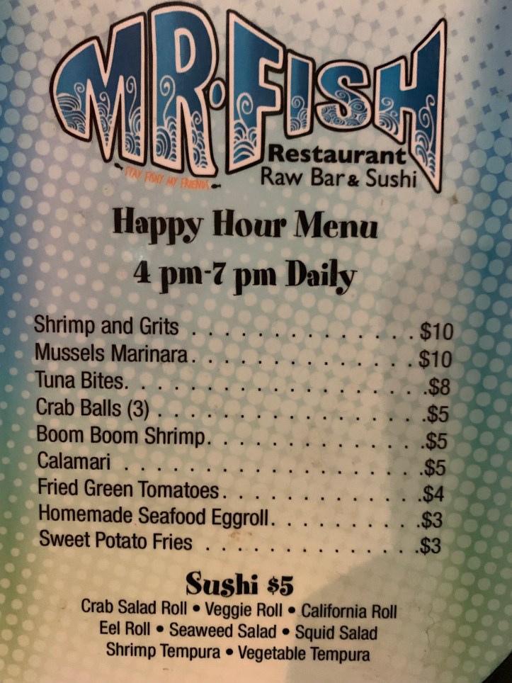 Mr. Fish is a Myrtle Beach Favorite that offers not only a Restaurant but a large Seafood Market as well. We have been coming here for years but never ate at the Restaurant. We stopped by for Happy Hour and were not disappointed. The Boom Boom Shrimp, Crab Balls, and Sushi were fantastic. We hope to come back here again for dinner in the near future. The Service and Atmosphere is great as well with the food coming in at an 8.5, Atmosphere 8.5 and Value 8.5. It’s an Overall Great Restaurant if your driving down 17 business.