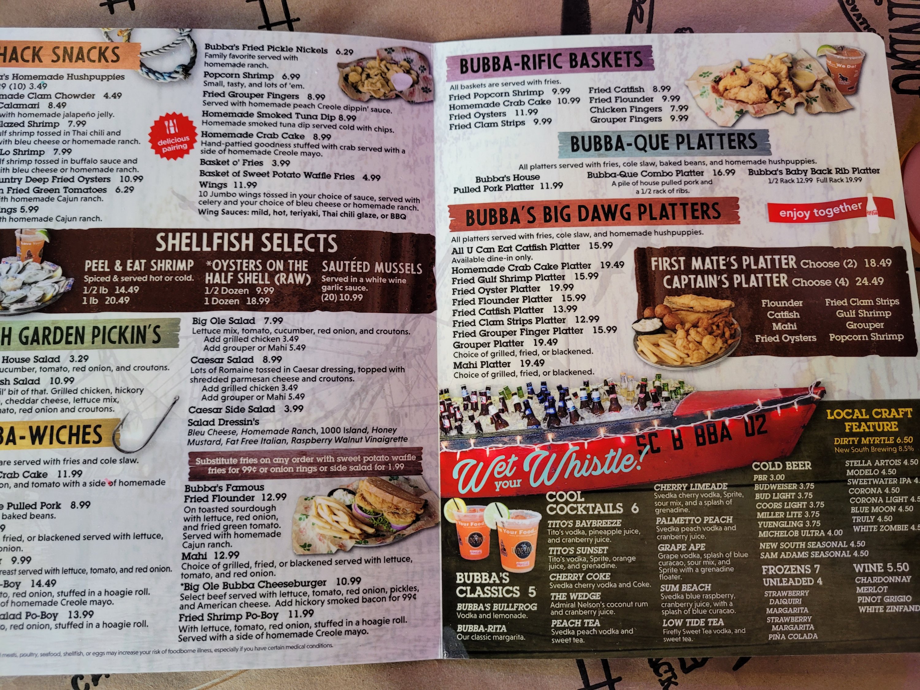 Located in Surfside Beach is a great seafood stop known as Bubba’s Fish Shack. Bubba’s has some awesome options from fried oysters to Blackened Mahi. They have something for everyone even some bbq options. Food comes in at 8.5, Atmosphere 9, Value 9. It’s a solid stop if your in the Surfside area.