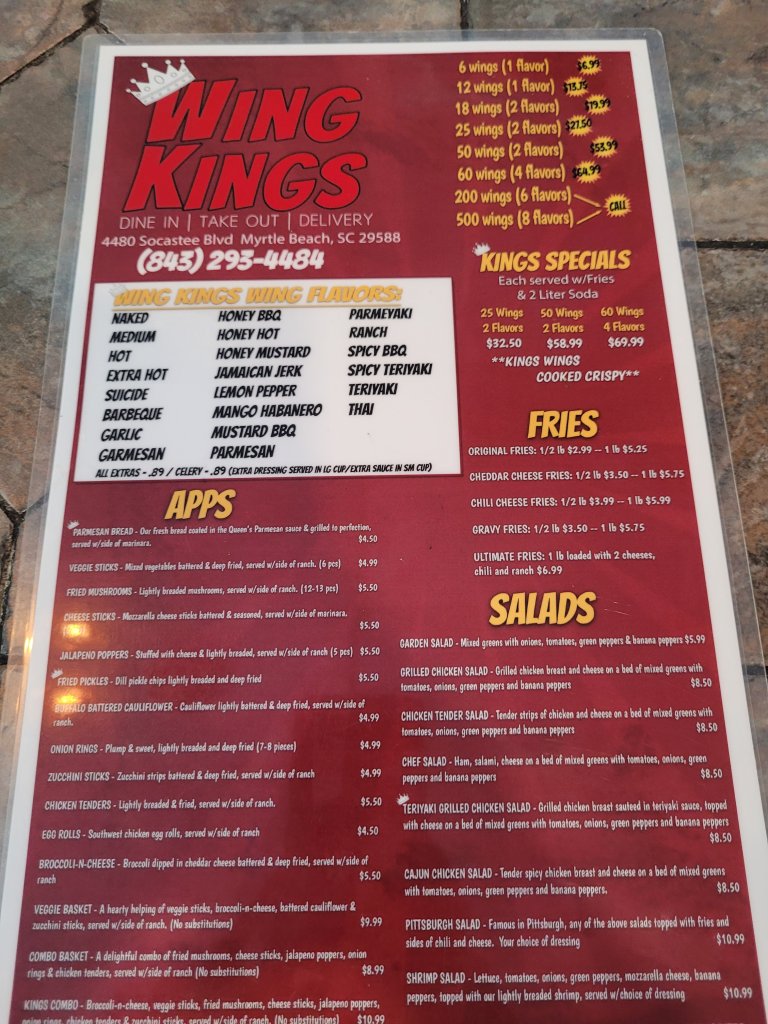 Located near Socastee, Wing Kings offers some awesome food at a great price. Eat in Delivery or Takeout they do it all. The Garmesean Wings were Fantastic and the Hot Dogs and Gravy Fries were an awesome deal. Give it a try if your in the area Food is a Solid 8.5, Value 9.5, Atmosphere 8.